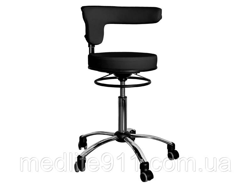 Стул для майстра модель 8085 чорного кольору з 2-ма регулювальними механізмами: зміна висоти стільця і висоти спинки. Регулювання висоти у вигляді металевого кола під сидінням. Спинка обертається по осі, може служити підлокітником. П'ятипроменева хрестовина з маневреними поліуретановими коліщатками забезпечує тихе і легке пересування.